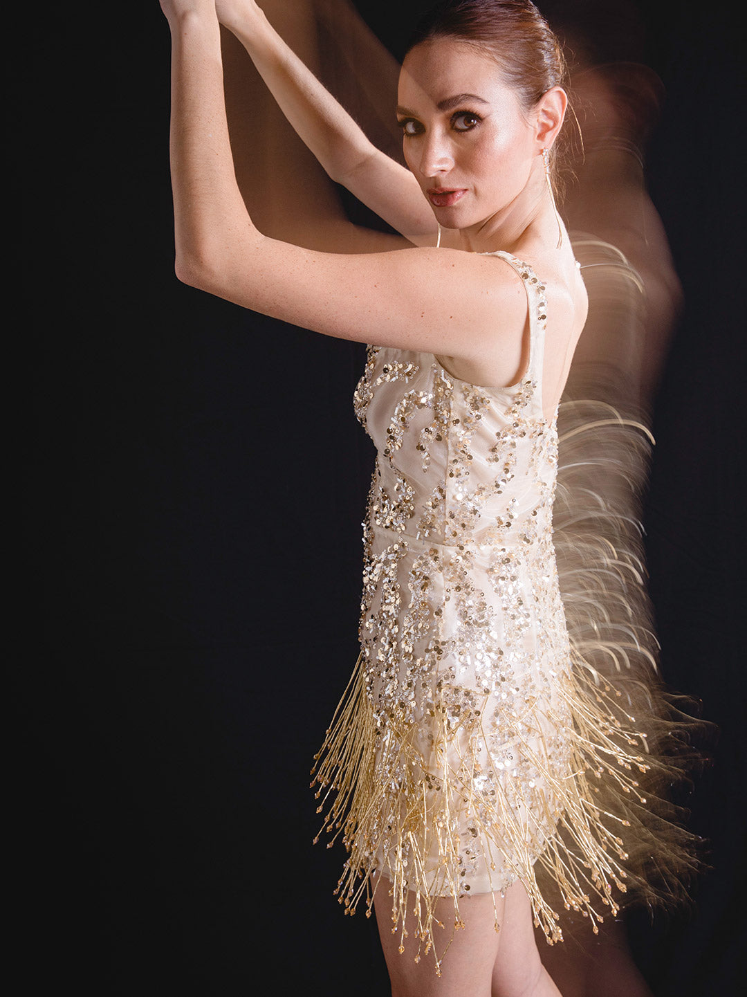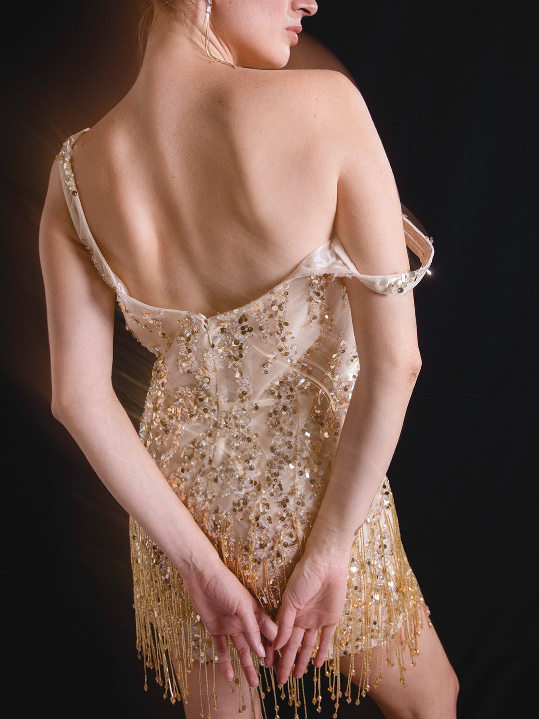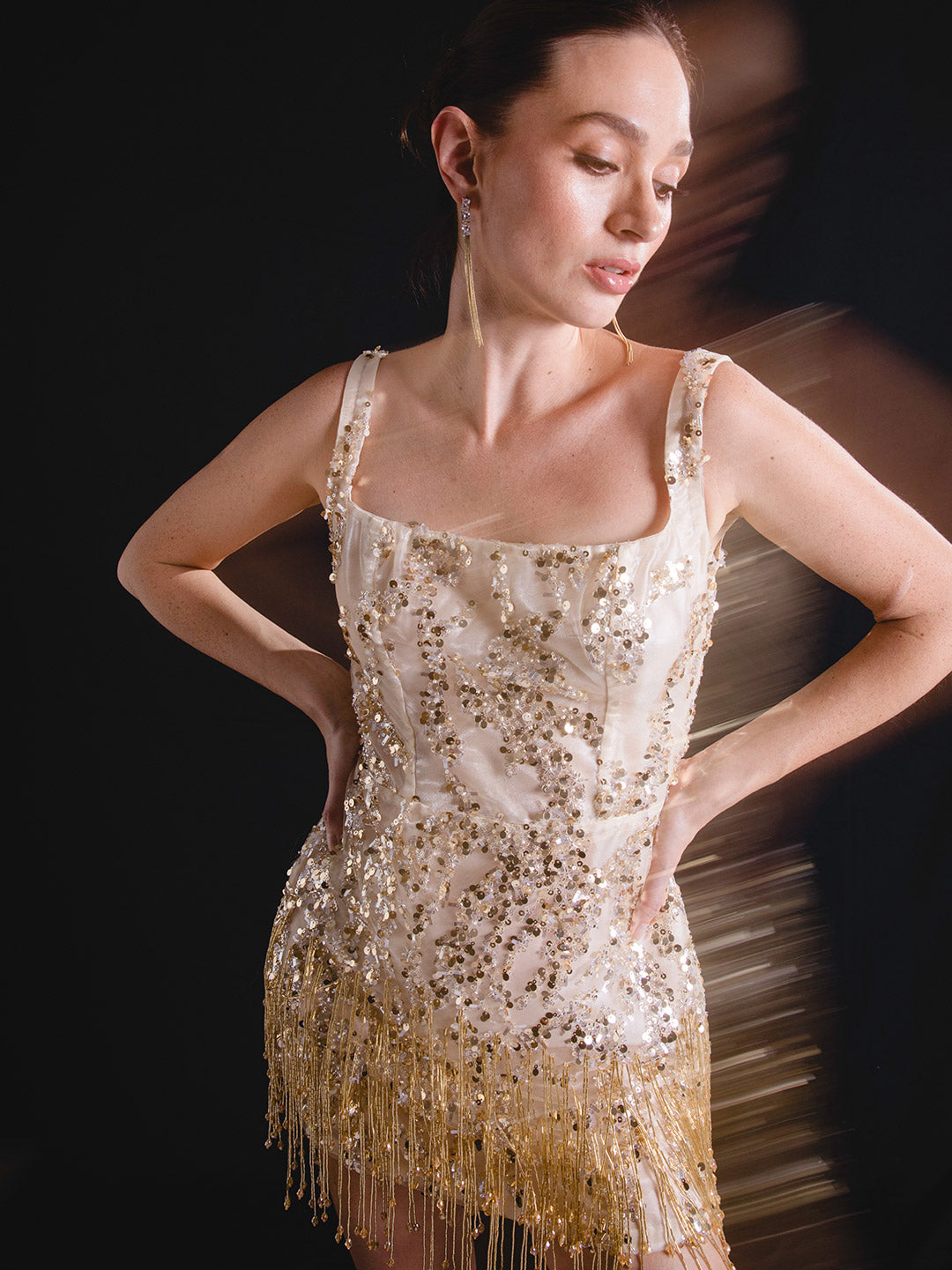 Vestido corto ajustado confeccionado en tul y organza con pedrería y lentejuelas doradas que aportan un brillo luminoso y sofisticado. Su escote cuadrado estiliza la figura con un acabado moderno, mientras que los flecos de piedras bordadas a mano añaden movimiento, textura y un toque de lujo artesanal.