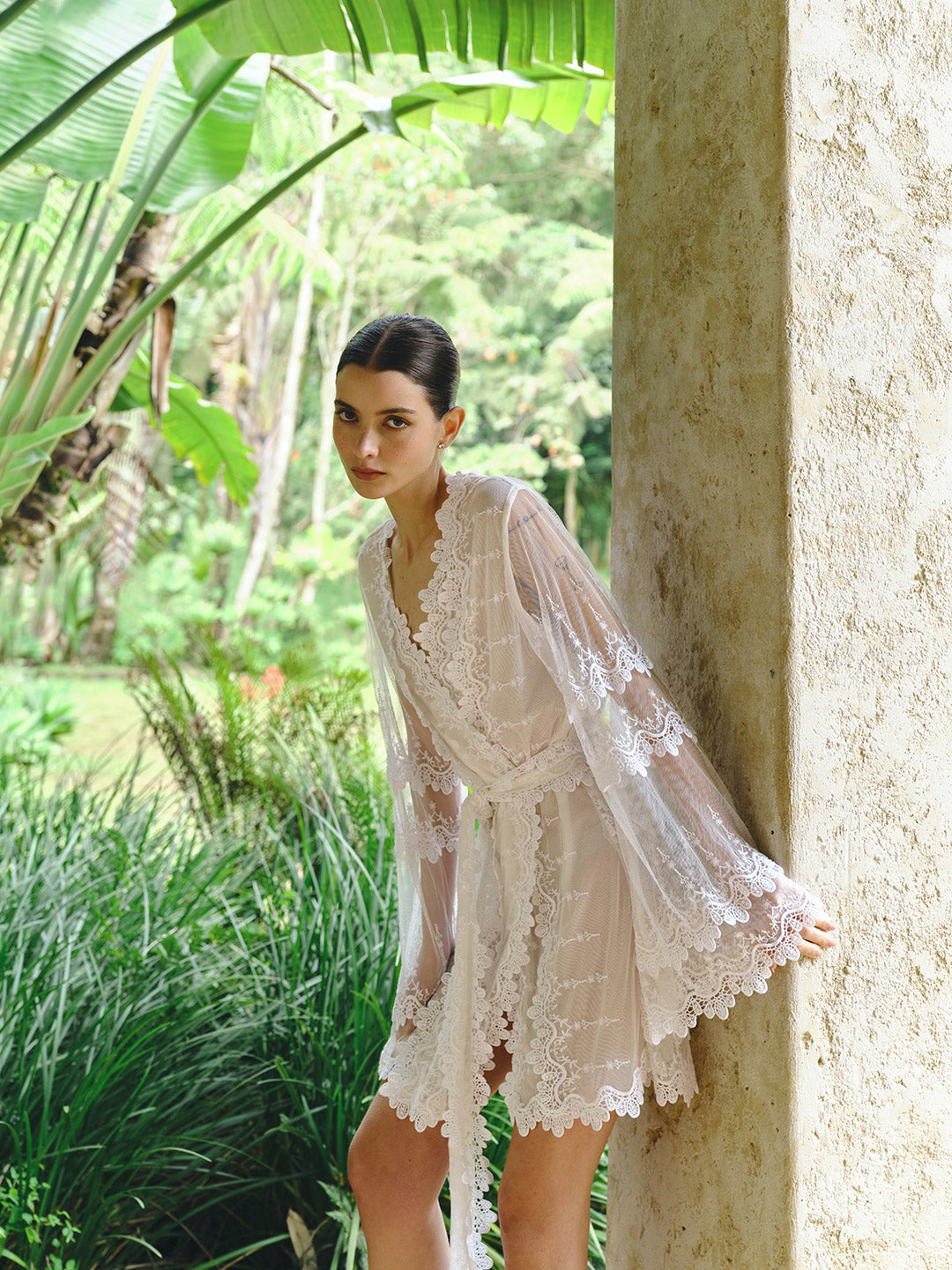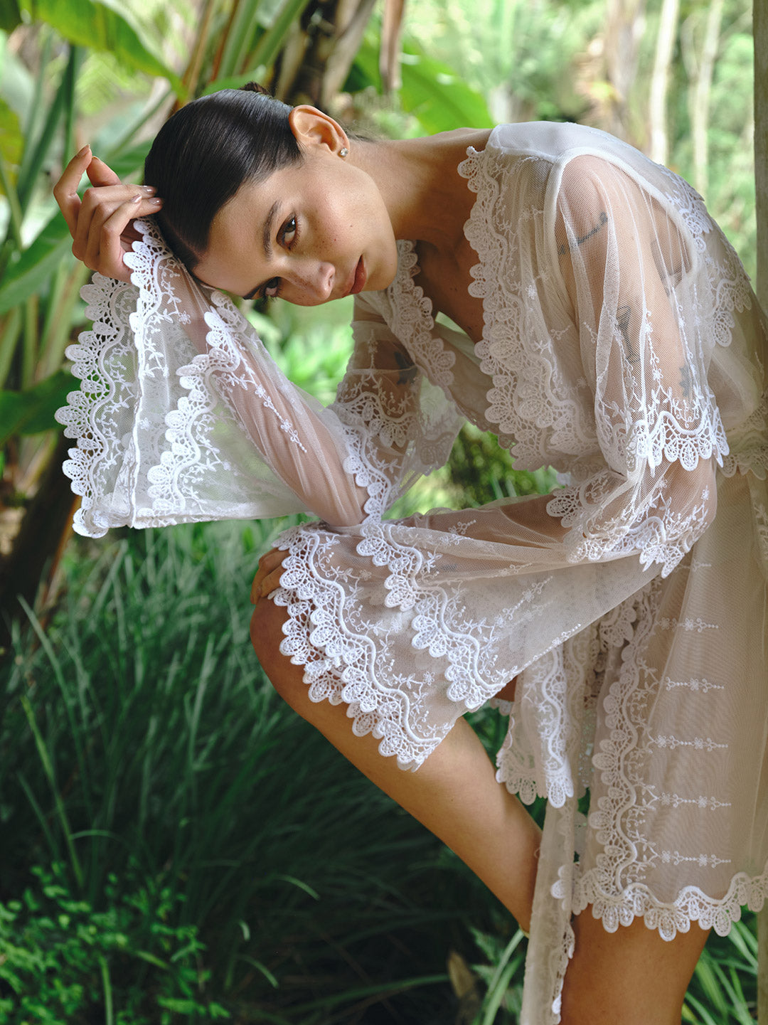 Kimono corto de novia confeccionado en malla ligera con franjas de bordados que recorren el cuerpo y las mangas. Su cinturón a juego permite ajustar la silueta con elegancia y comodidad, convirtiéndolo en una pieza bridal sofisticada y moderna. Perfecto para el ritual de novia.