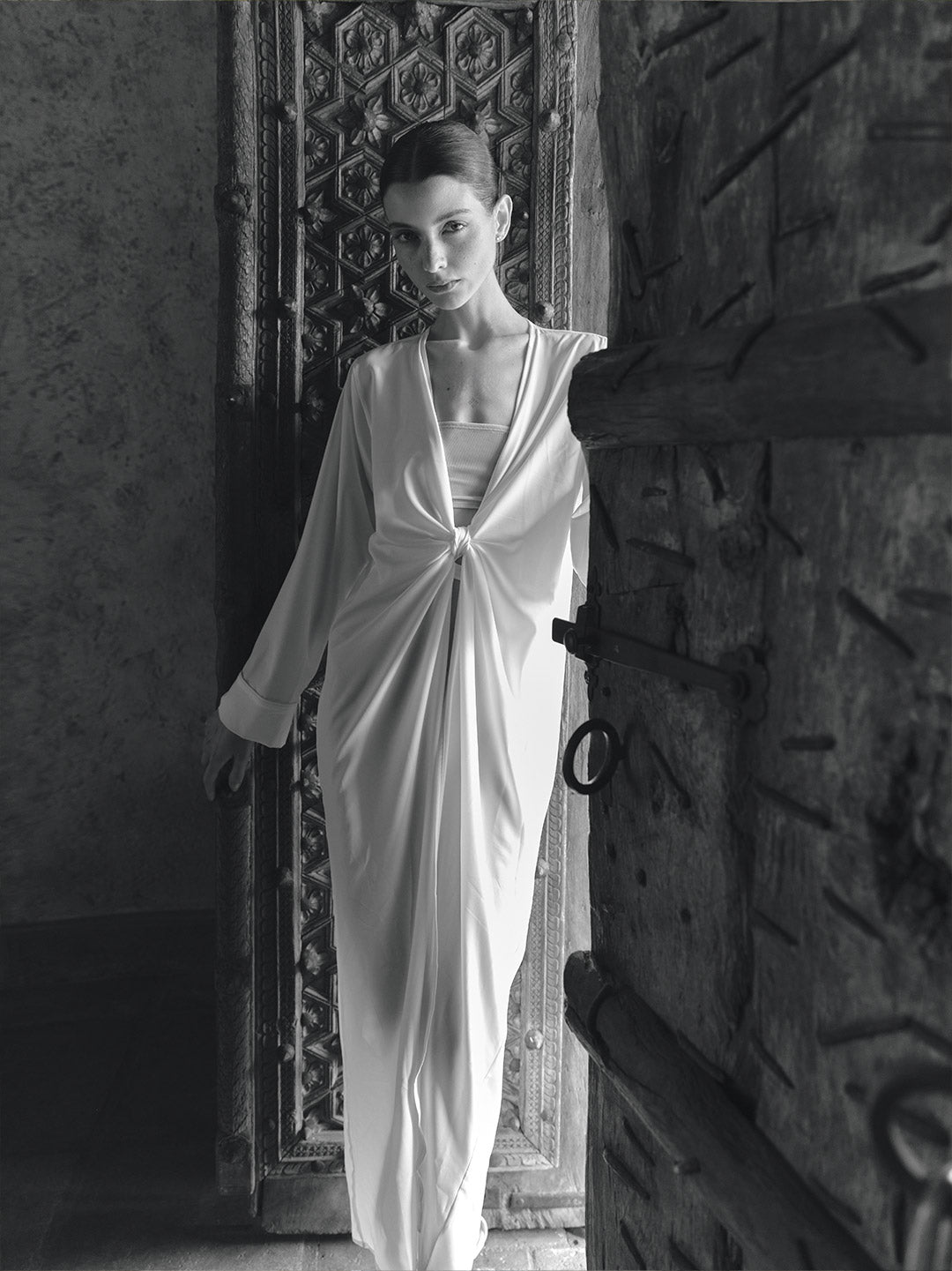 Kimono de novia confeccionado en tul semitransparente con mangas largas ajustadas en puño. Sus tiras delgadas permiten cruzarlo delicadamente en el cuerpo, creando un efecto envolvente y sofisticado. Una pieza bridal versátil y etérea, ideal para el ritual de novia o como complemento de un look minimalista.