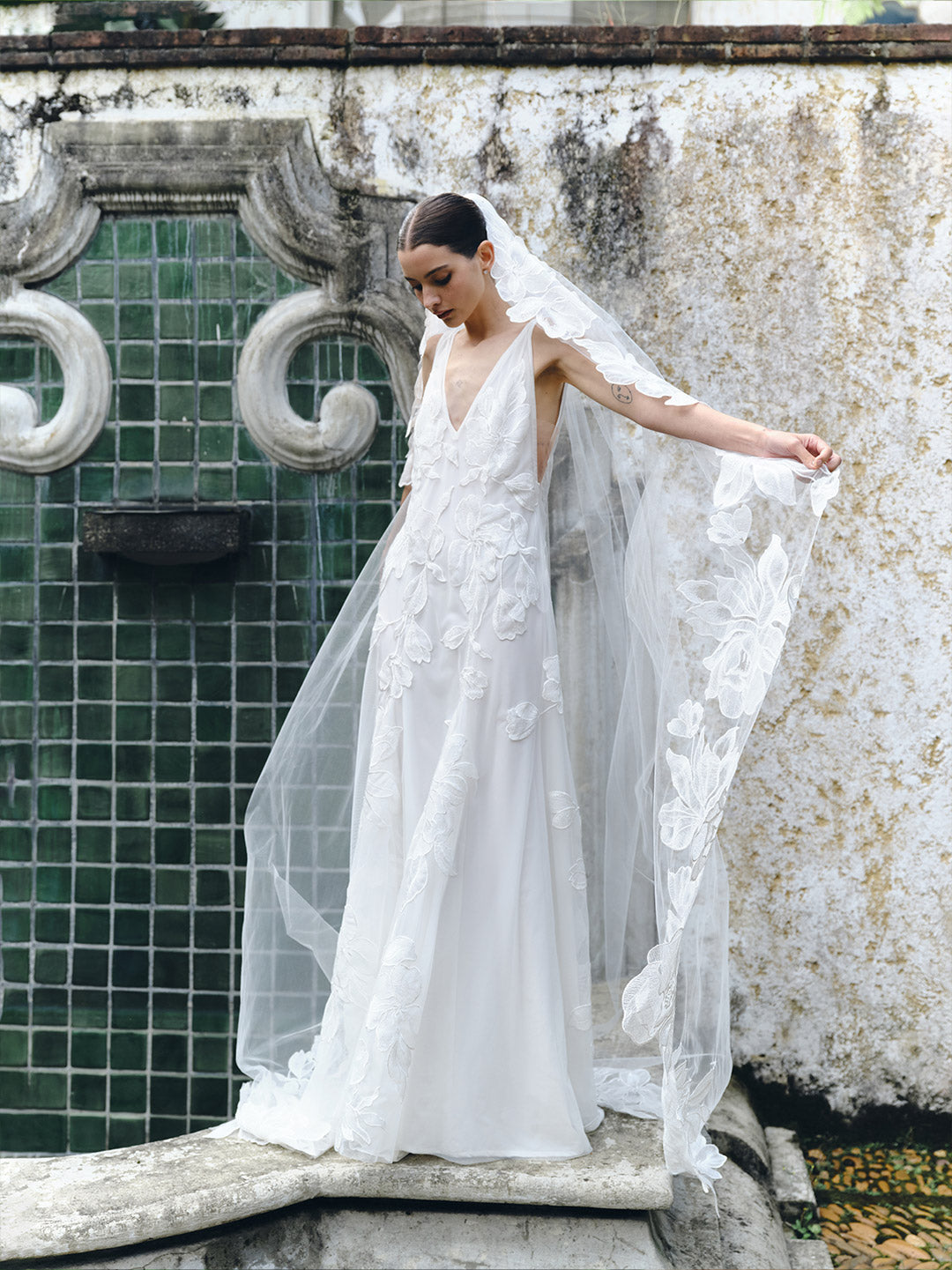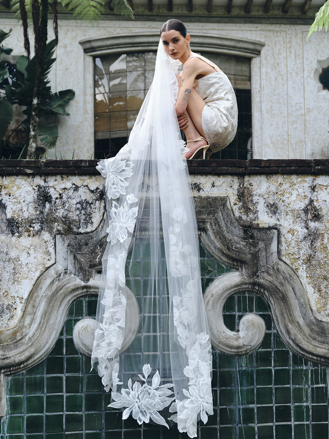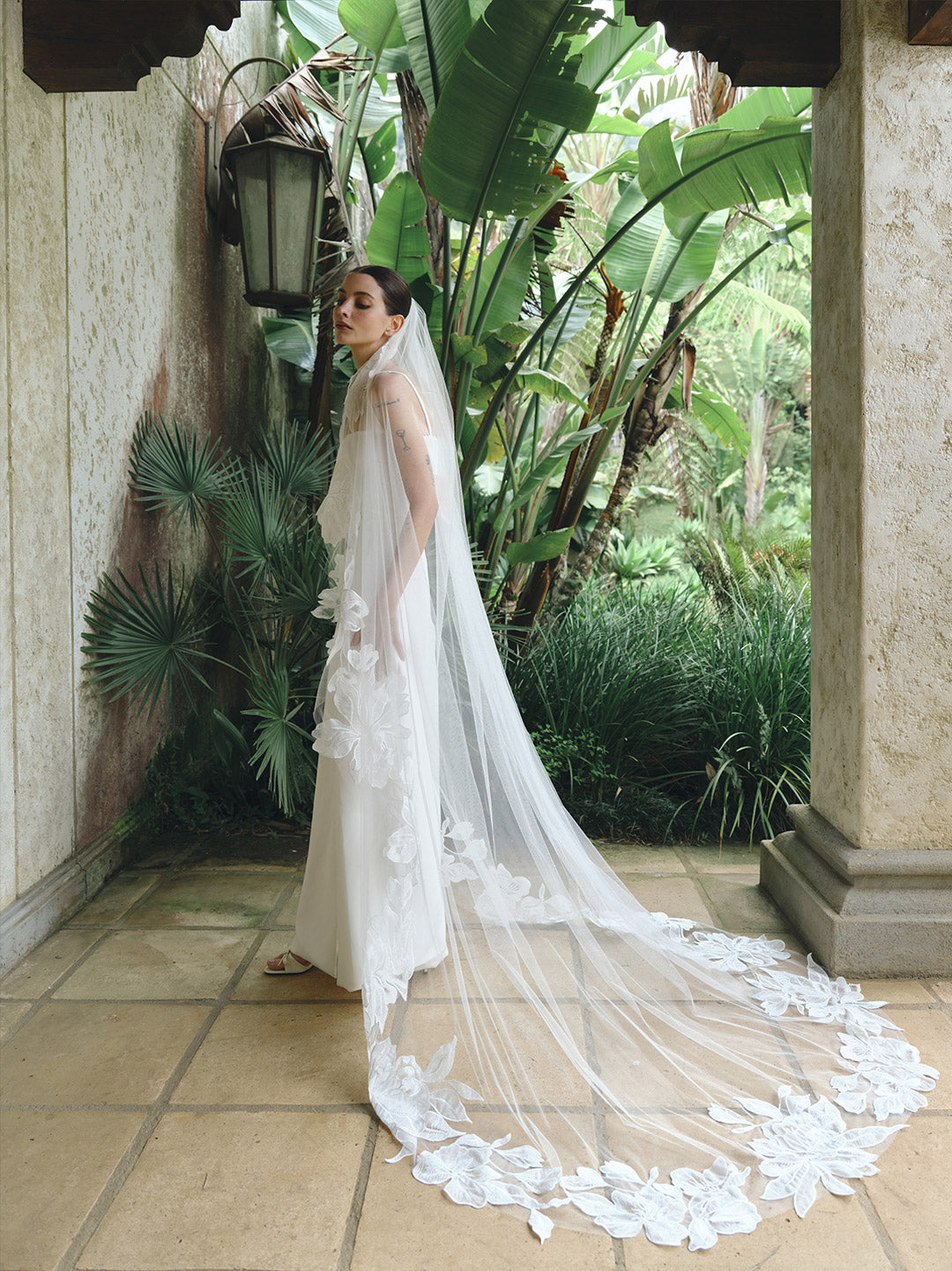 Velo largo de novia confeccionado en tul azucarado con un sutil brillo que aporta luminosidad y movimiento. El contorno está delicadamente bordado con flores de hilo blanco y plateado, creando un acabado romántico y etéreo. Una pieza bridal sofisticada, pensada para transformar cualquier look en un momento inolvidable.