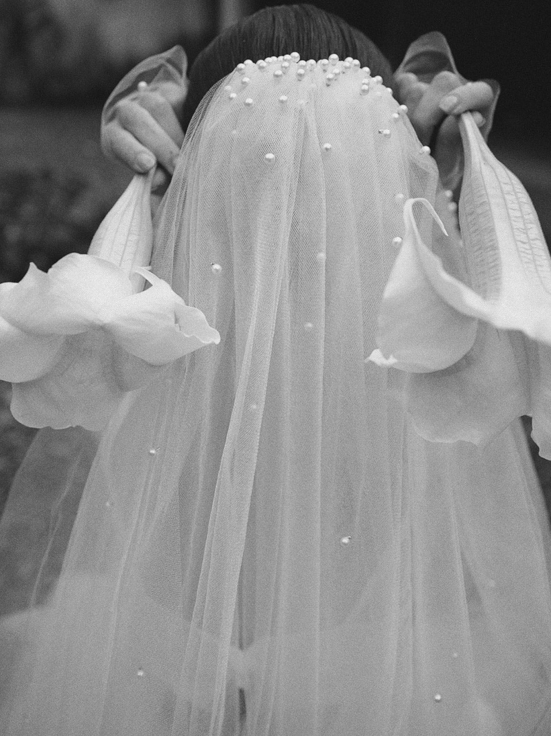Velo corto y voluminoso de novia, elaborado en tul azucarado con sutil brillo. Decorado con perlas aplicadas a mano en efecto lluvia, aporta un aire fresco, moderno y sofisticado al look bridal. Una pieza diferente y de alto impacto, ideal para novias que buscan reinterpretar el velo tradicional con un giro contemporáneo.