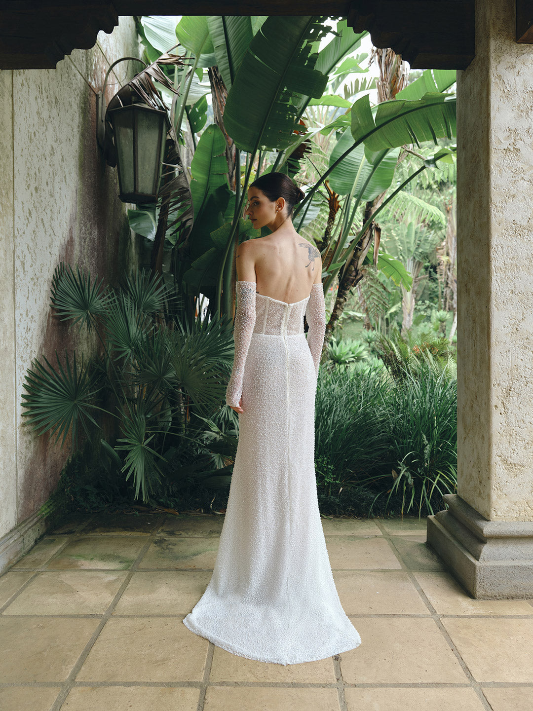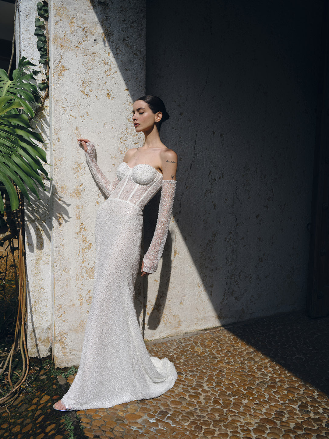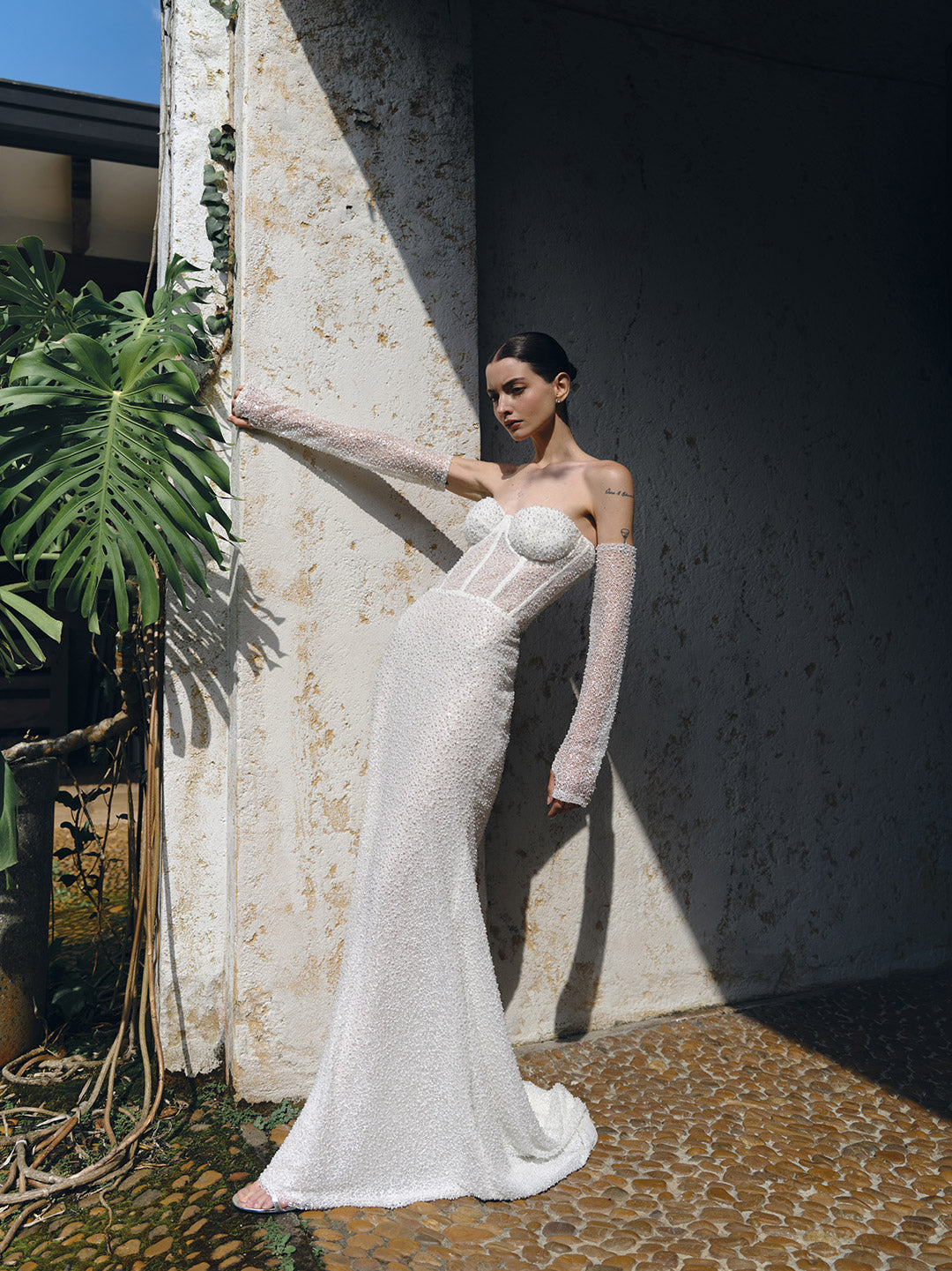 Vestido de novia ajustado y estructurado diseñado para resaltar la silueta con elegancia moderna. Con corpiño strapless con copas marcadas y acabado preciso, aporta un fit sofisticado y femenino. Los guantes semitransparentes en malla recamada de perlas elevan el look con un detalle único y de alta costura, ideal para una novia que busca un estilo poderoso y contemporáneo.