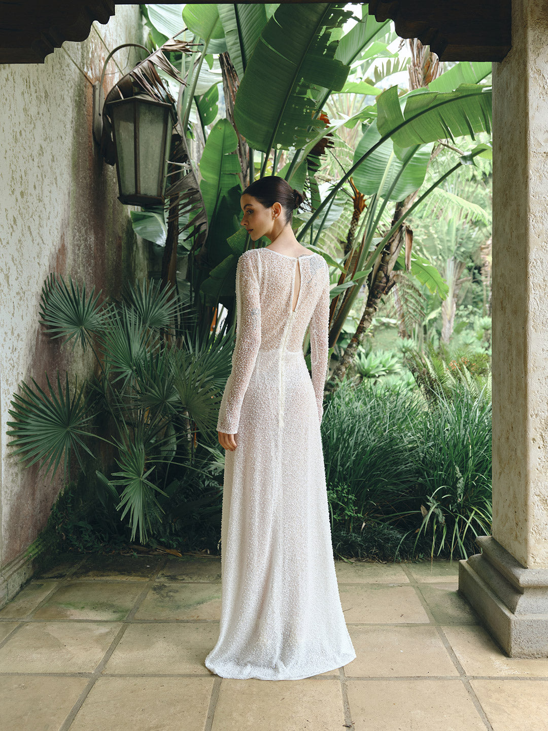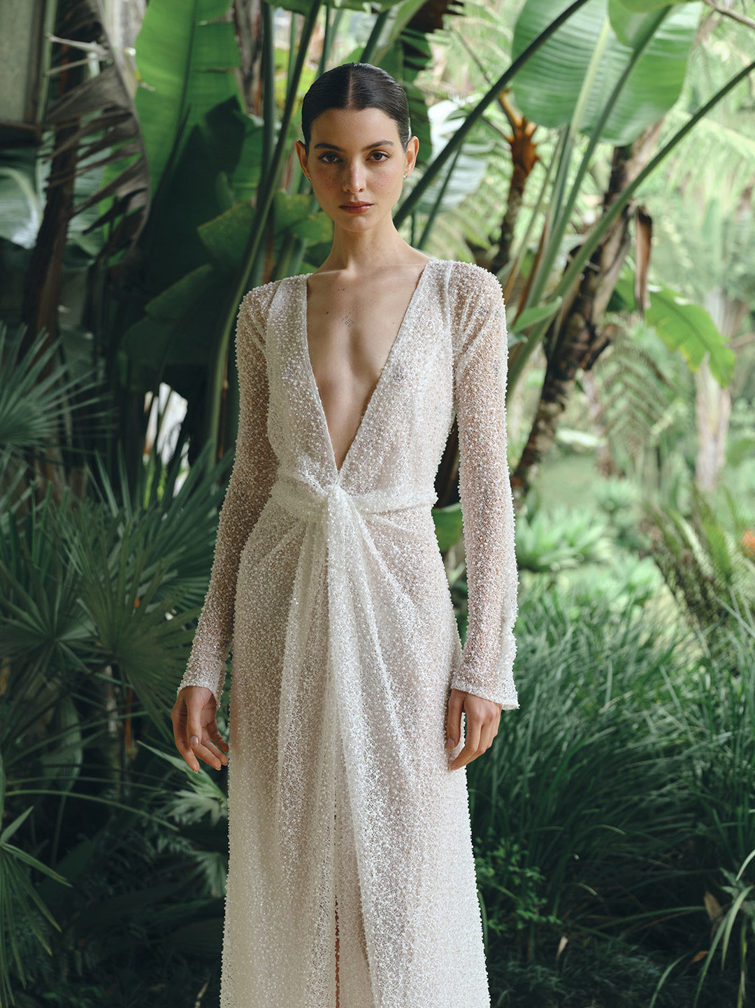 Vestido de novia semitransparente confeccionado en malla tejida con perlas blancas. Su diseño ajustado con mangas largas y detalle de nudo frontal enmarca la silueta con un aire contemporáneo y sensual. El escote profundo en V y la abertura central en la pierna aportan un carácter atrevido y sofisticado, perfecto para novias que buscan un look bridal de alto impacto.