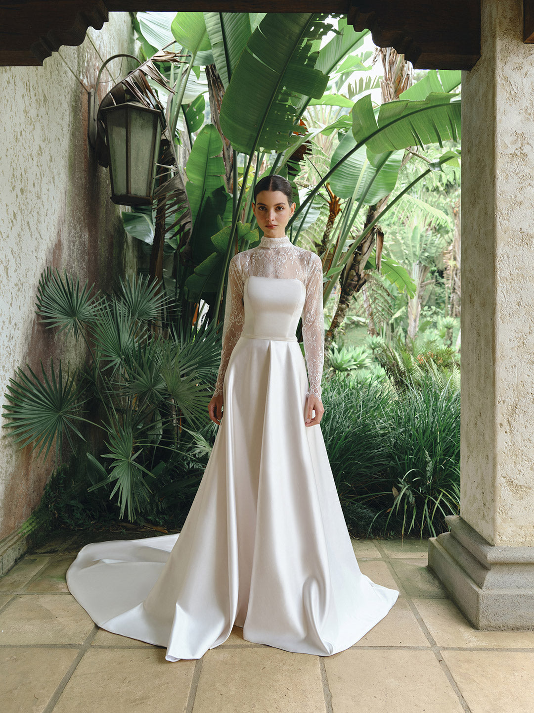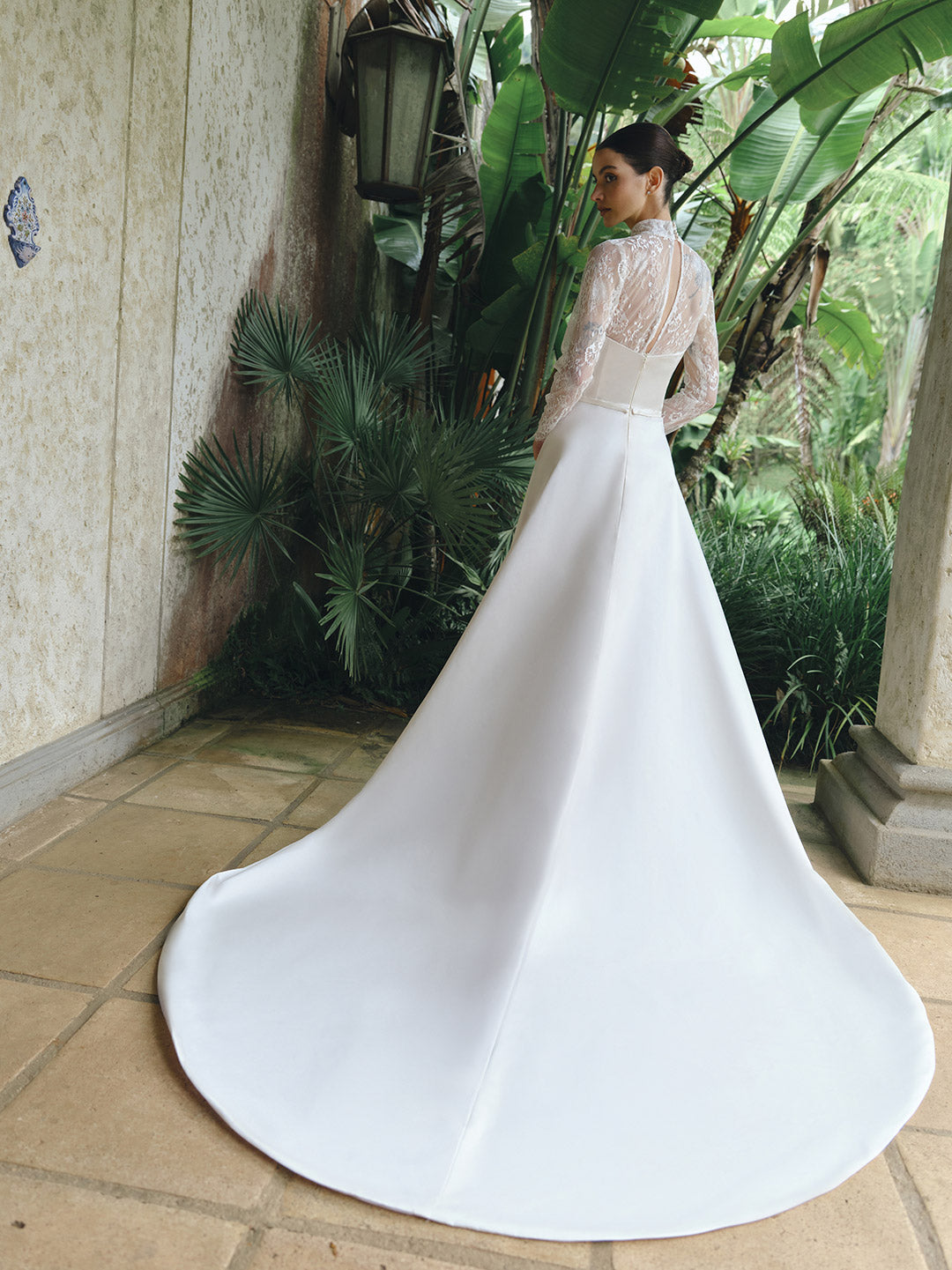 Vestido de novia elaborado en podeswa sólido con corpiño estructurado y falda rotonda con cola. En su interior, un body en encaje maxi floral con mangas largas y cuello alto añade contraste y romanticismo, acompañado de un panty en tela control que aporta comodidad y soporte. Una propuesta bridal imponente y sofisticada, que combina estructura y ligereza en un mismo diseño.