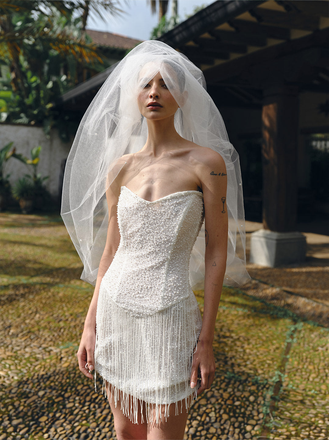 Vestido de novia mini confeccionado en malla de hilo recamada con perlas para un acabado delicado y luminoso. El escote corazón y la cintura en pico estilizan la silueta, mientras que los flecos de canutillos blancos enmarcan la cintura con movimiento y brillo artesanal. Un diseño moderno y festivo, ideal para afterparty o como look de cambio bridal.