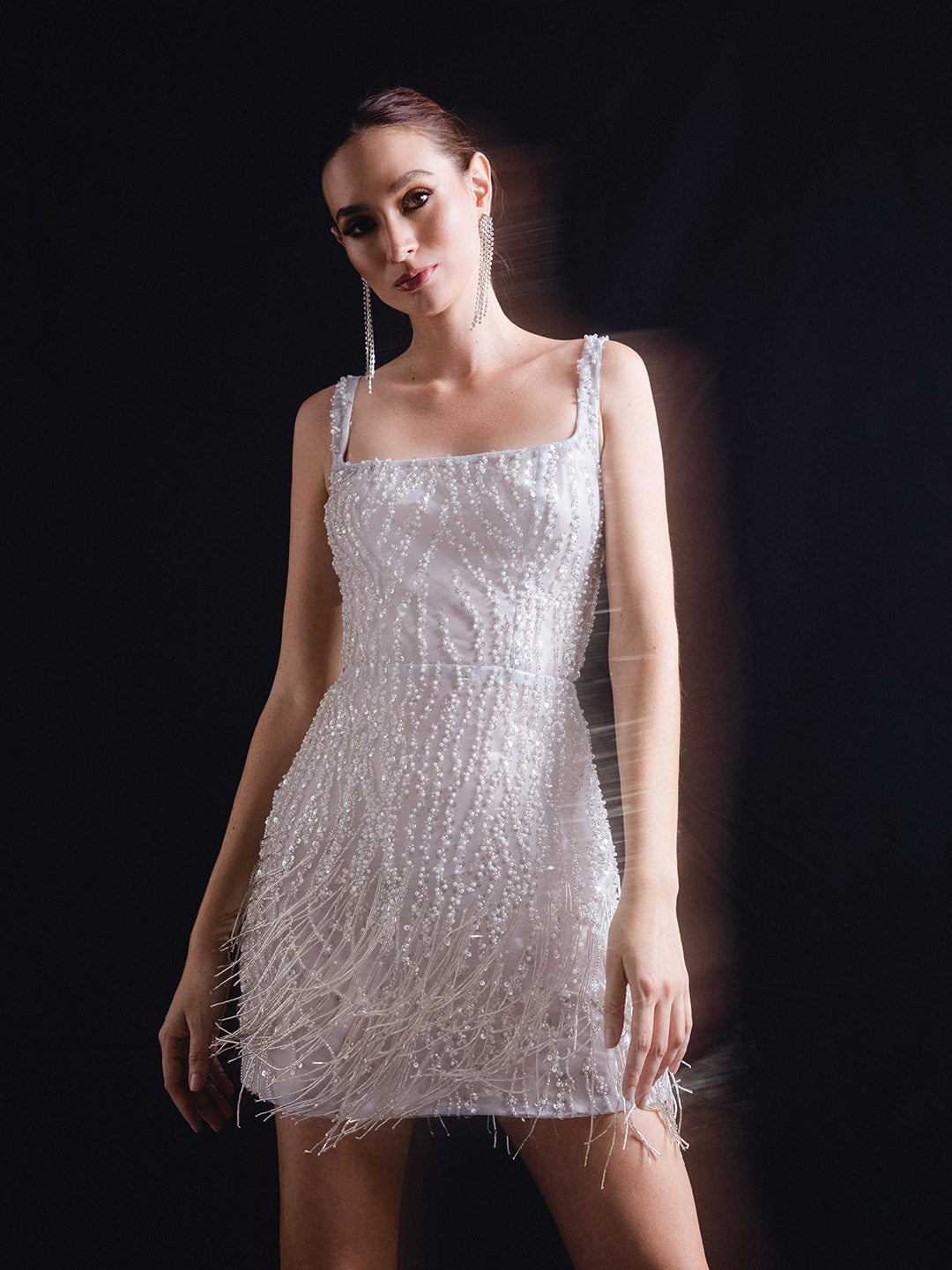 Vestido corto ajustado confeccionado en tul y organza con pedrería y lentejuelas plateadas que aportan un brillo luminoso y sofisticado. Su escote cuadrado estiliza la figura con un acabado moderno, mientras que los flecos de piedras bordadas a mano añaden movimiento, textura y un toque de lujo artesanal.