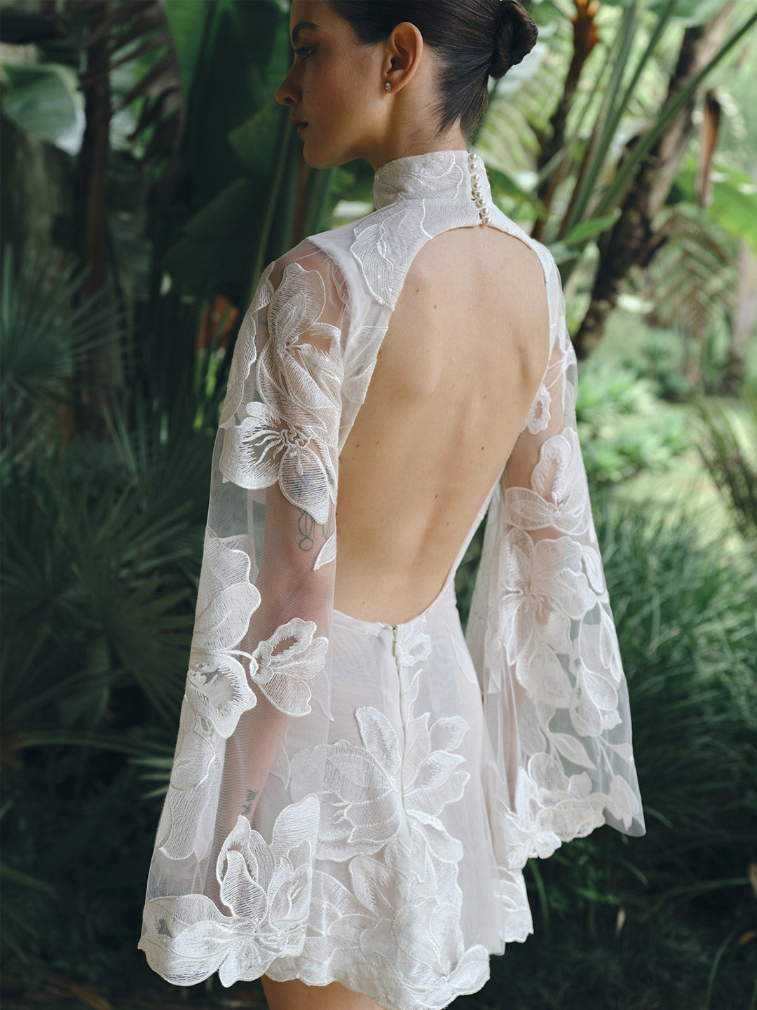Vestido corto de novia, diseñado como look de cambio moderno y sofisticado. Con silueta suelta y espalda descubierta en escote amplio, combina frescura y feminidad. La falda con medio vuelo aporta movimiento ligero, mientras que las mangas tipo campana en encaje maxi floral con forro doble mesh, elevan el diseño con un aire romántico y editorial.