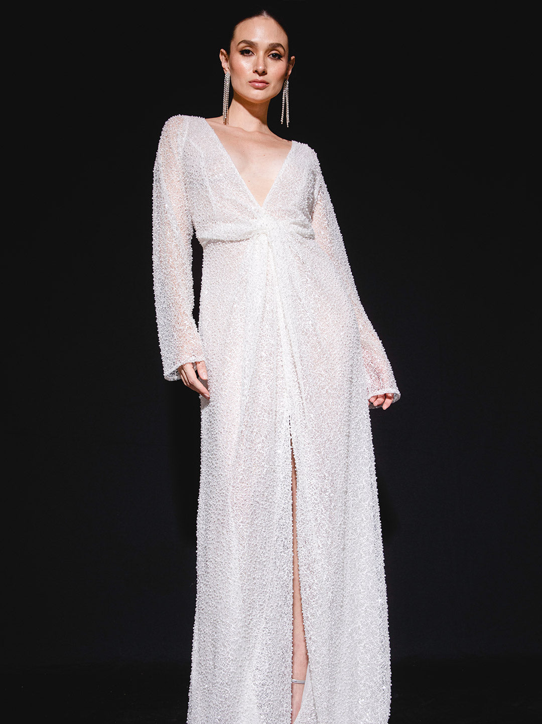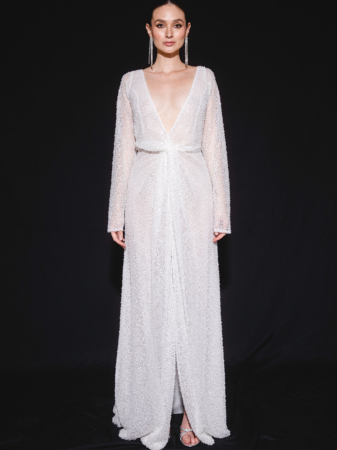 Vestido de novia semitransparente confeccionado en malla tejida con perlas blancas. Su diseño ajustado con mangas largas y detalle de nudo frontal enmarca la silueta con un aire contemporáneo y sensual. El escote profundo en V y la abertura central en la pierna aportan un carácter atrevido y sofisticado, perfecto para novias que buscan un look bridal de alto impacto.