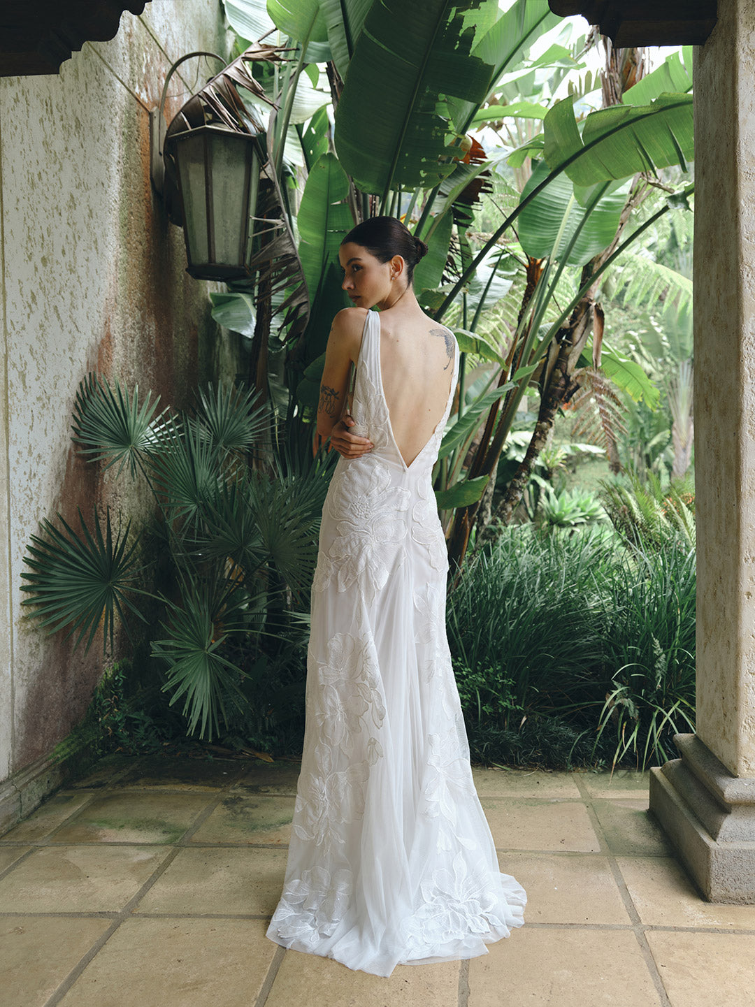 Wedding dress with a deep V-neckline and side mesh transparencies. The semi-mermaid skirt in tulle with godets opens with movement and is adorned with hand-embroidered lace appliqués. The internal lining in A-type lycra provides comfort without losing structure. An elegant and modern design, ideal for highlighting the silhouette with sophistication.