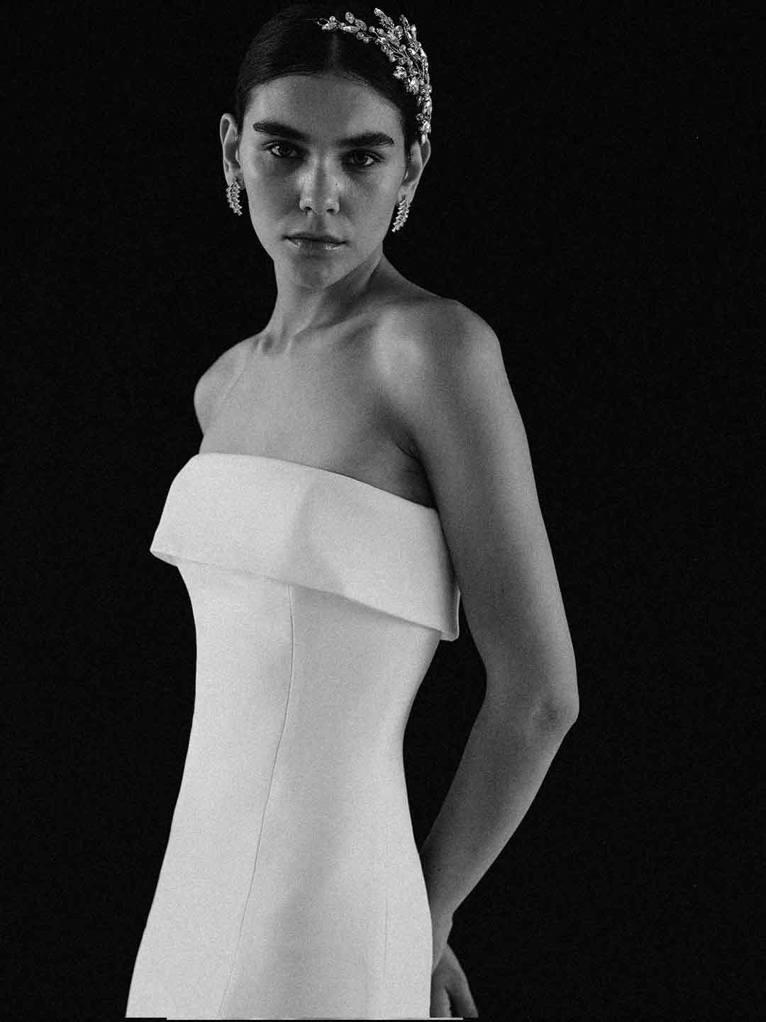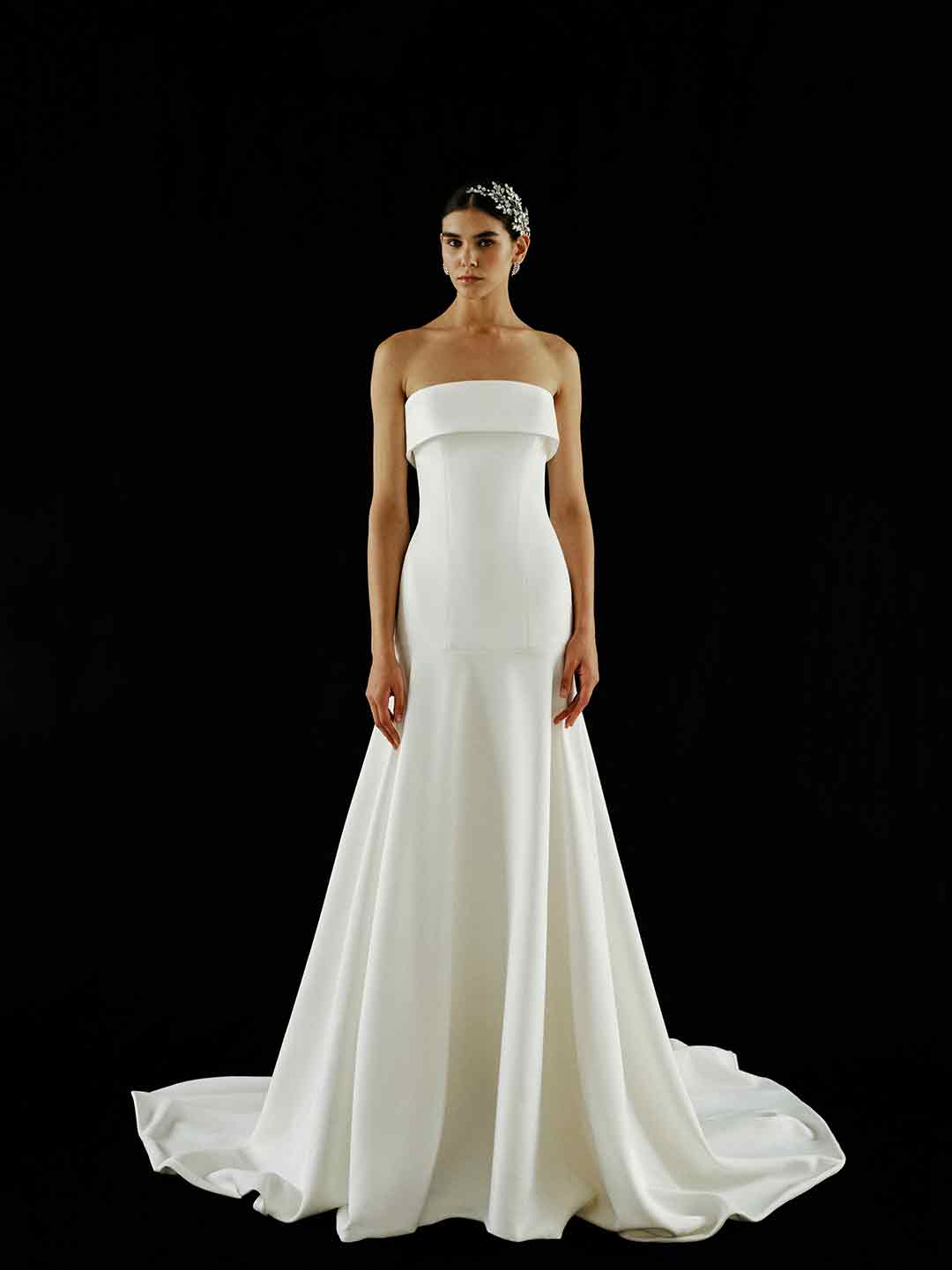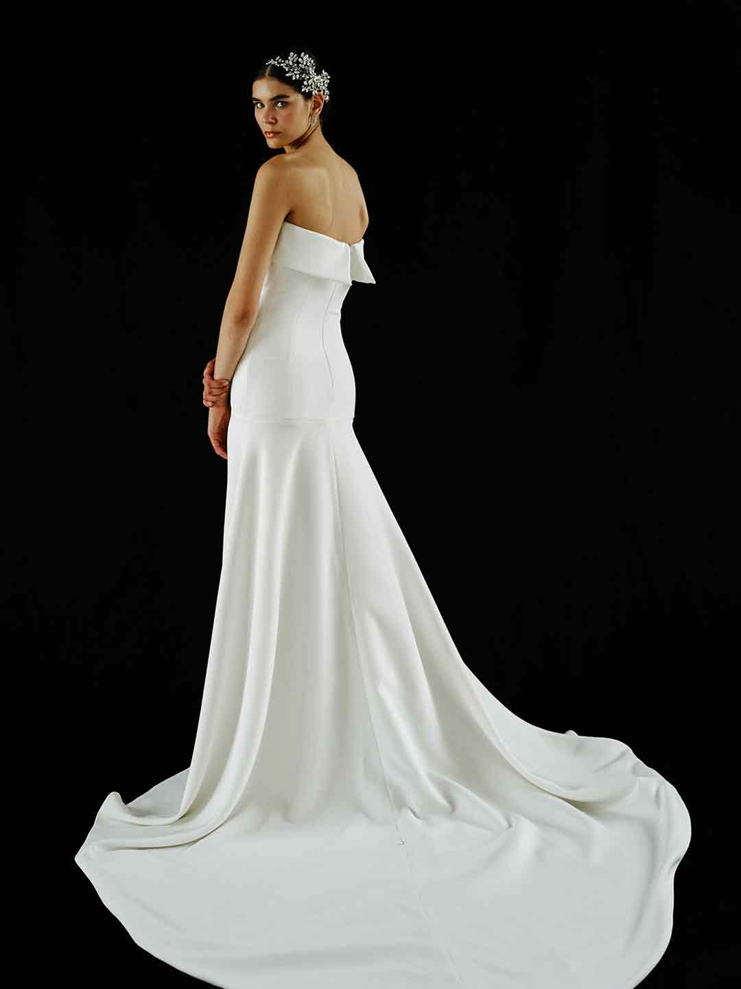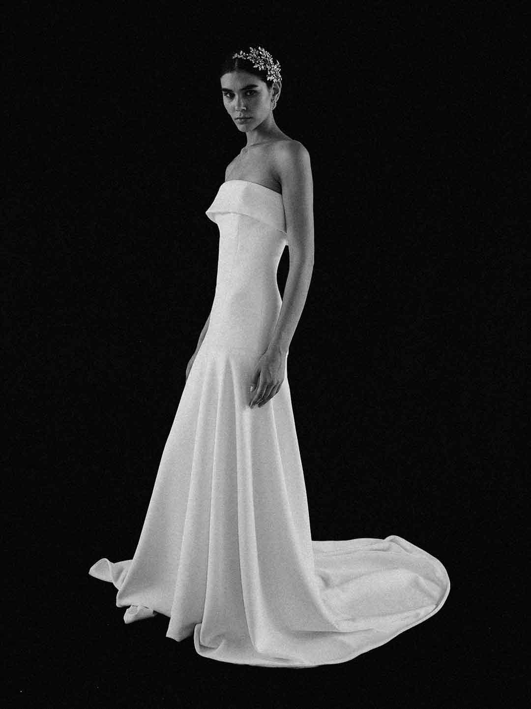Strapless wedding dress structured in crepe, designed to enhance the silhouette with an elegant and sophisticated aesthetic. The structured bodice provides support and definition, while the lapel on the chest adds a modern and refined detail.
